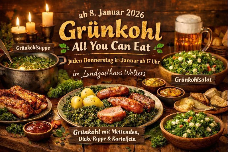 Der Winter ist Grünkohlzeit – und wir freuen uns, euch auch im kommenden Jahr wieder zu unserer beliebten Donnerstagsaktion „Grünkohl all you can eat“ einzuladen! Ab Donnerstag, den 08. Januar 2026, heißt es bei uns jeden Donnerstag: ab 17:00 Uhr schlemmen, genießen und satt werden. Freut euch auf ein reichhaltiges Buffet mit vielen leckeren Grünkohlvariationen. Unter anderem erwarten euch: frischer Grünkohlsalat herzhafte Grünkohlsuppe klassischer Grünkohl mit Mettendendi cke Rippe, Kartoffeln und vieles mehr, was das Grünkohl-Herz begehrt. Ob traditionell oder modern interpretiert nach Wolters-Art– bei unserem Buffet ist für jeden Geschmack etwas dabei. Wie jedes Jahr gilt: Der Treffpunkt für alle Grünkohl-Fans ist das Landgasthaus Wolters. Kommt vorbei, bringt Familie und Freunde mit und genießt einen gemütlichen Donnerstagabend in geselliger Atmosphäre. Wir freuen uns auf euren Besuch und auf eine genussvolle Grünkohl-Saison! Die Termine: 08.01.2026 - Noch freie Tische zur Auswahl 15.01.2026 - Noch freie Tische zur Auswahl 22.01.2026 - Noch freie Tische zur Auswahl 29.01.2026 - Noch freie Tische zur Auswahl