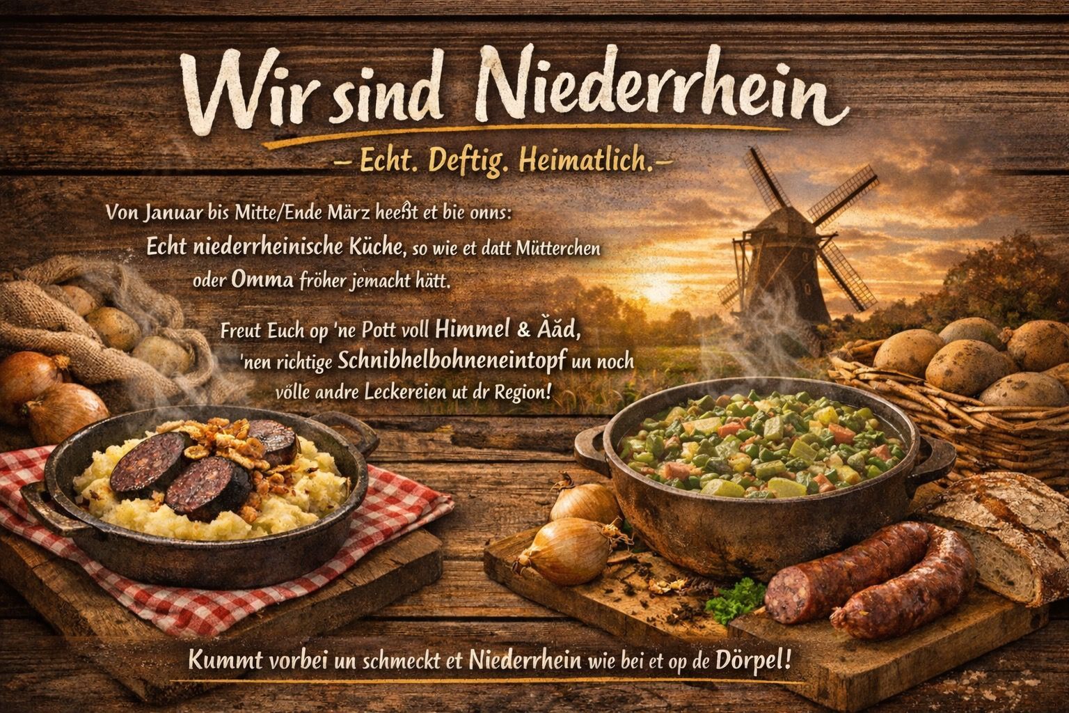 Typisch niederrheinische Klassiker wie Himmel un Ääd, Schnibbelbohnen-Eintopf und weitere herzhafte Gerichte stehen bei uns im Mittelpunkt.